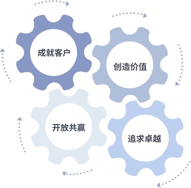 成就客户是一切决策的出发点,,,,创造价值是衡量所有工作的标准,,,追求卓越是我们做事做人的态度,,,开放共赢是我们的格局也是最终的结果。。。价值观的齿轮环环相扣,,,推动着组织里的每个人不断向前。。。。